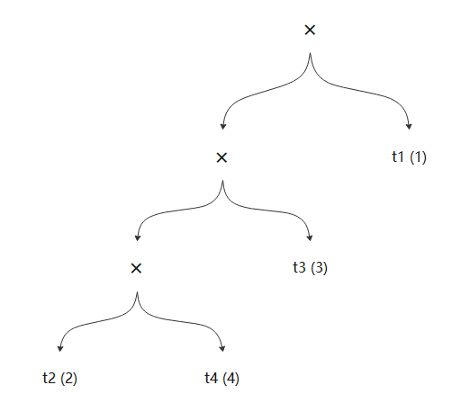 在openGauss数据库中,每个染色体都默认使用的是左深树,因此每个染色体的基因编码确定后,它的连接树也就随之确定了,比如针对{2, 4, 3, 1}这样一条染色体,它对应的连接树就是(((t2,t4),t3), t1),如图6-14所示。