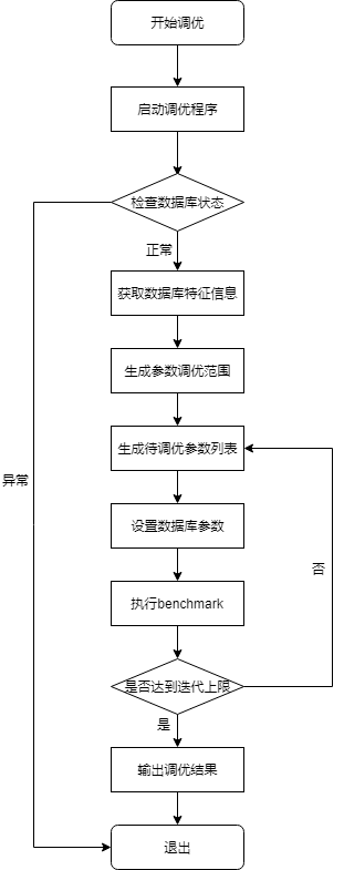 常规评价调优效果好坏的方法是运行benchmark,包括TPC-C、TPC-H以及用户自定义的banchmark,用户只需要进行少量适配即可。离线参数调优的流程图如图8-2所示。