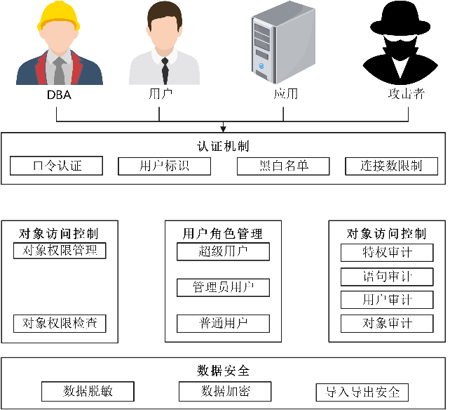 不同于数据库其他业务模块,安全管理模块并非逻辑集中的。安全管理模块中的安全能力是分散化的,在数据库整个业务逻辑的不同阶段提供对应的安全能力,从而构建数据库整体纵深安全防御能力。一个完整的安全管理整体架构如图9-1所示。