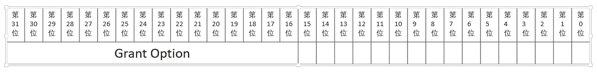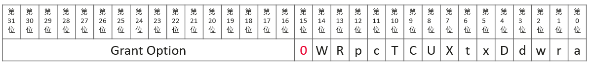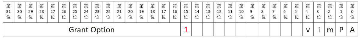 其中ai_privs字段是AclMode类型。AclMode是一个32位的比特位。其高16位为权限选项位,当该比特位取值为1时,表示AclItem中的ai_grantee对应的用户具有此对象的相应操作的授权权限,否则表示用户没有授权权限;低16位为操作权限位,当该比特位取值为1时,表示AclItem中的ai_grantee对应的用户具有此对象的相应操作权限,否则表示用户没有相应的权限。在AclMode的结构位图9-18中,Grant Option记录各权限位的权限授予或被转授情况。低16位记录各权限的授予情况,当授权语句使用ALL时,则表示对象的所有权限。