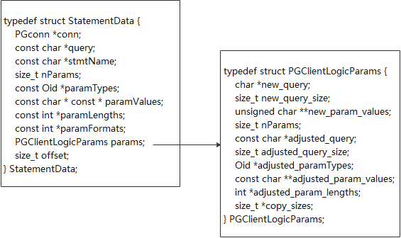用户执行SQL查询语句时,通过Pqexec函数执行SQL语句,SQL语句在发送之前首先进入run_pre_query函数函数,通过前端解析器解析涉及密态的语法。然后在run_pre_statement函数中通过分类器对语法标签进行识别,进入对应语法的处理逻辑。在不同的处理逻辑函数中,查找出要替换的数据参数,并存储在结构体StatementData中,数据结构如图9-38所示。最后通过replace_raw_values函数重构SQL语句,将其发送给服务端。在PqgetResult函数接收到从服务端返回的数据时,若是加密数据类型,则用deprocess_value函数对加密数据进行解密。接收完数据后还需要在run_post_query函数中刷新相应的缓存。