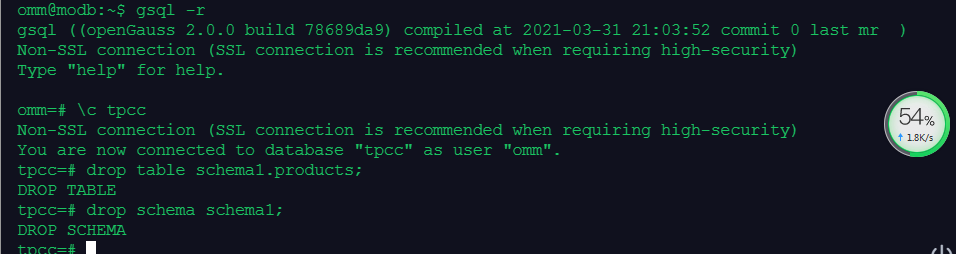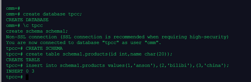 su - omm gsql -r1.创建数据库tpcc,在数据库tpcc中创建模式schema1,在模式schema1中建表products create database tpcc; \c tpcc create schema schema1; create table schema1.products(id int,name char(20)); insert into schema1.products values(1,'anson'),(2,'bilibi'),(3,'china');2.使用gs_dump工具以文本格式导出数据库tpcc的全量数据 \q gs_dump -f /home/omm/backup_database_tpcc_all.sql tpcc -F p3.使用gs_dump工具以文本格式导出模式schema1的定义 gs_dump -f /home/omm/backup_schema_define.sql tpcc -n schema1 -s -F p4.使用gs_dump工具以文本格式导出数据库tpcc的数据,不包含定义 gs_dump -f /home/omm/backup_database_tpcc_data.sql tpcc -a -F p5.删除表、模式和数据库 gsql -r \c tpcc drop table schema1.products; drop schema schema1; \c omm #需要切换到非本数据库 drop database tpcc;openGauss导出数据学习。