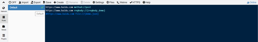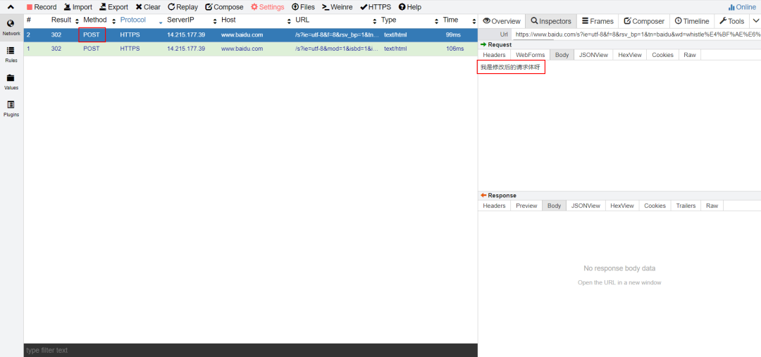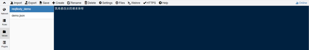 --2、修改请求方法和请求体Rules:https://www.baidu.com method://postRules:https://www.baidu.com reqBody://{reqBody_demo}Values:reqBodey_demo 我是修改后的请求体呀