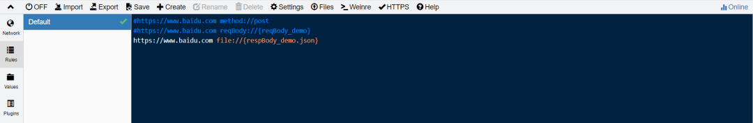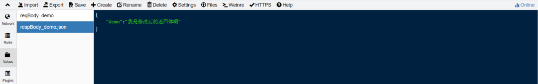--3、修改返回体Rules:https://www.baidu.com file://{respBody_demo.json}Values:respBody_demo.json{"demo":"我是修改后的返回体啊"}