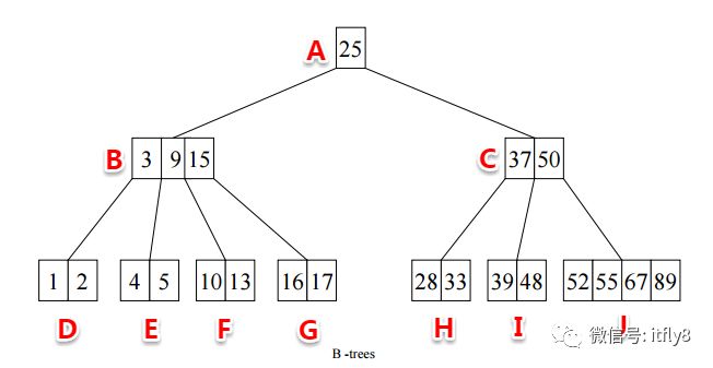 B树(Balance Tree)又叫做B- 树(其实B-是由B-tree翻译过来,所以B-树和B树是一个概念) ,它就是一种平衡多路查找树。下图就是一个典型的B树: