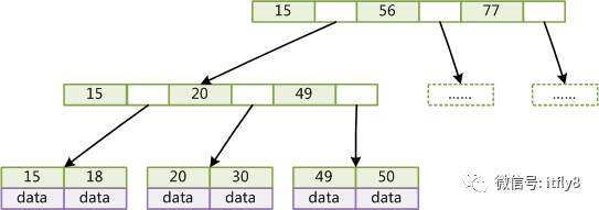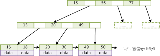 如图所示,在B+Tree的每个叶子节点增加一个指向相邻叶子节点的指针,就形成了带有顺序访问指针的B+Tree。做这个优化的目的是为了提高区间访问的性能,例如图4中如果要查询key为从18到49的所有数据记录,当找到18后,只需顺着节点和指针顺序遍历就可以一次性访问到所有数据节点,极大提到了区间查询效率。