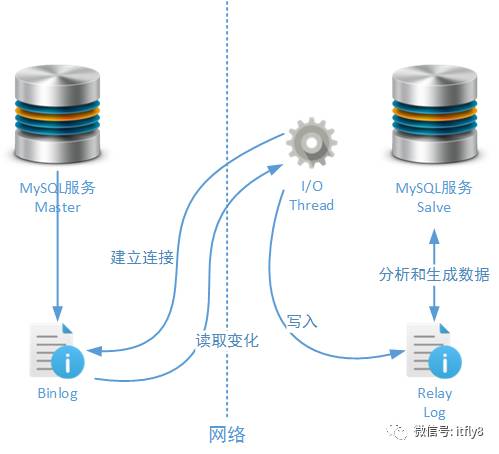 Replicaion机制从技术层面讲,存在两种基本角色:Master和Salve。Master节点负责在Replicaion机制中,向一个或者多个目标输出数据,而Salve节点负责在Replicaion机制中接受Master节点传来的数据。在实际业务环境下,Master节点和Salve节点还分别有另外一个名字:Write节点和Read节点——是的,利用Replicaion机制我们可以搭建以读写分离为目标的MySQL集群服务。但是为了保证读者在阅读文章内容时不会产生歧义,在本文(和后续文章)中我们都将使用Master节点和Salve节点这样的称呼。Replicaion机制依靠MySQL服务的二进制日志同步数据: