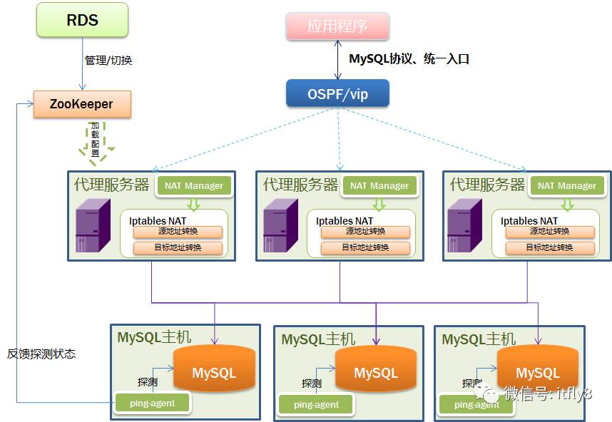 所以我们采用了一种折中的方案,启动了RDS项目,主要用于提供MySQL内部云服务,其中高可用方案如下图所示,采用了iptables的NAT来实现MySQL的代理路由功能。