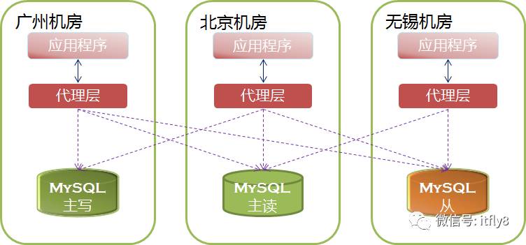 从上图可以看出,应用程序永远也不再需要考虑多机房高可用、负载均衡、读写分离的问题。而且由于代理层实现了高可用功能,一旦发现主写MySQL故障,会自动把主读切换为主写,从而在秒级实现FAILOVER。