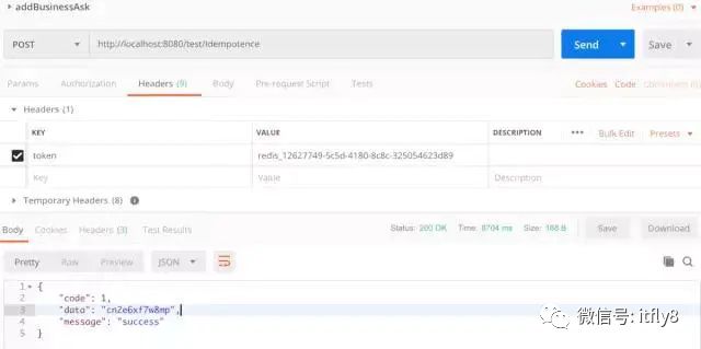 @RestControllerpublicclass BusinessController {@Resourceprivate TokenService tokenService;@Resourceprivate TestService testService;@PostMapping("/get/token")public String getToken() {String token = tokenService.createToken();if (StrUtil.isNotEmpty(token)) {ResultVo resultVo = new ResultVo();resultVo.setCode(Constant.code_success);resultVo.setMessage(Constant.SUCCESS);resultVo.setData(token);return JSONUtil.toJsonStr(resultVo);}return StrUtil.EMPTY;}@AutoIdempotent@PostMapping("/test/Idempotence")public String testIdempotence() {String businessResult = testService.testIdempotence();if (StrUtil.isNotEmpty(businessResult)) {ResultVo successResult = ResultVo.getSuccessResult(businessResult);return JSONUtil.toJsonStr(successResult);}return StrUtil.EMPTY;}}