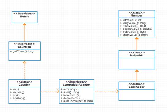 Counter内部通过持有LongAdderAdapter的实例来实现Counting接口,而LongAdderAdapter内部依赖的是JDK1.8并发原子操作的LongAdder。