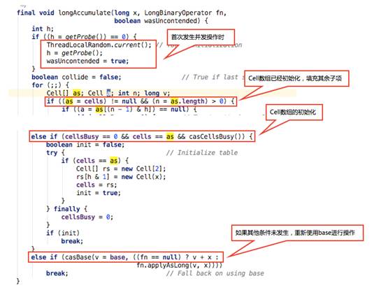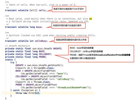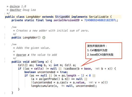 5. 发生并发:通过Cell数组将原子操作分散到子项中进行,Cell是Striped64的内部类,里面有存储long值的value字段。