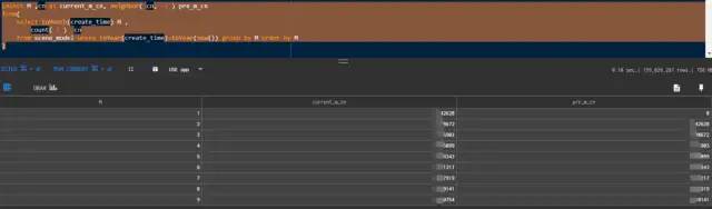 #统计今年每月H5制作量环比增长情况select M ,cn as current_m_cn, neighbor( cn, -1 ) pre_m_cnfrom(select toMonth(create_time) M ,count( 1 ) cnfrom scene_model where toYear(create_time)=toYear(now()) group by M order by M)