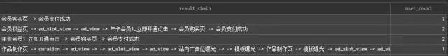 SELECTresult_chain,uniqCombined(user_id) AS user_countFROM (selectu_i as user_id,arrayStringConcat( #获取访问路径字符串arrayCompact( #相邻事件去重arrayMap(b - > tupleElement(b, 1),arraySort( #对用户事件进行排序得到用户日志的先后顺序y - > tupleElement(y, 2),arrayFilter((x, y) - > y - x.2 > 3600 #找到目标节点前1小时内的所有事件arrayMap((x, y) - > (x, y),groupArray(e_t),groupArray(time)),arrayWithConstant(length(groupArray(time)),maxIf(time, e_t = '会员支付成功') #设置目标节点))))),'->') result_chainfrombw.scene_trackerwheretoDate(time) >= '2020-09-30' AND toDate(time) <= '2020-10-02' AND user_id IN (10266,10022,10339,10030)group byu_i) tabGROUP BY result_chainORDER BY user_count DESC LIMIT 20;