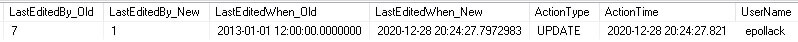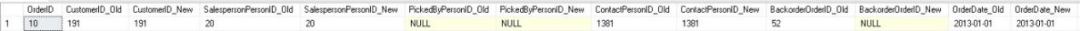 CREATE TABLE Sales.Orders_log( Orders_log_ID int NOT NULL IDENTITY(1,1)CONSTRAINT PK_Sales_Orders_log PRIMARY KEY CLUSTERED,OrderID int NOT NULL,CustomerID_Old int NOT NULL,CustomerID_New int NOT NULL,SalespersonPersonID_Old int NOT NULL,SalespersonPersonID_New int NOT NULL,PickedByPersonID_Old int NULL,PickedByPersonID_New int NULL,ContactPersonID_Old int NOT NULL,ContactPersonID_New int NOT NULL,BackorderOrderID_Old int NULL,BackorderOrderID_New int NULL,OrderDate_Old date NOT NULL,OrderDate_New date NOT NULL,ExpectedDeliveryDate_Old date NOT NULL,ExpectedDeliveryDate_New date NOT NULL,CustomerPurchaseOrderNumber_Old nvarchar(20) NULL,CustomerPurchaseOrderNumber_New nvarchar(20) NULL,IsUndersupplyBackordered_Old bit NOT NULL,IsUndersupplyBackordered_New bit NOT NULL,Comments_Old nvarchar(max) NULL,Comments_New nvarchar(max) NULL,DeliveryInstructions_Old nvarchar(max) NULL,DeliveryInstructions_New nvarchar(max) NULL,InternalComments_Old nvarchar(max) NULL,InternalComments_New nvarchar(max) NULL,PickingCompletedWhen_Old datetime2(7) NULL,PickingCompletedWhen_New datetime2(7) NULL,LastEditedBy_Old int NOT NULL,LastEditedBy_New int NOT NULL,LastEditedWhen_Old datetime2(7) NOT NULL,LastEditedWhen_New datetime2(7) NOT NULL,ActionType VARCHAR(6) NOT NULL,ActionTime DATETIME2(3) NOT NULL,UserName VARCHAR(128) NULL);