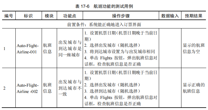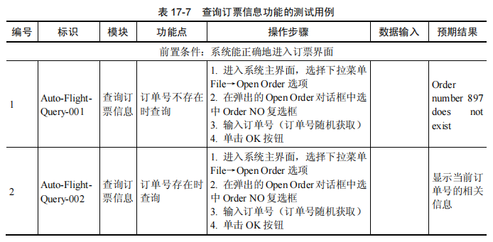 查询订票信息功能的测试用例见表 17-7,实例中主要按航班来查询。