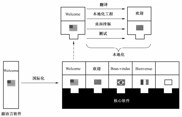 软件的翻译、本地化工程、桌面排版和测试,合称软件本地化过程。核心软件模块如果进行了正确的国际化设计,多种语言的软件本地化过程可以快速有效地并行处理,不需要对核心软件代码进行修改,这样就可以做到多个本地化语言的版本和源语言版本同步发布。