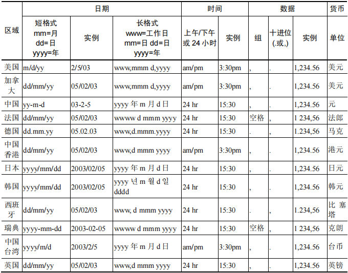 不同区域的数据格式表达有所不同,关于数据格式的本地化主要考虑以下几方面的问题。