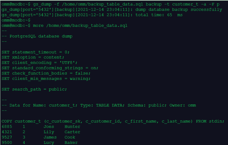 gs_dump -f /home/omm/backup_table_data.sql backup -t customer_t -a -F p