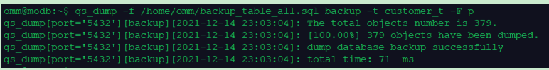 gs_dump -f /home/omm/backup_table_all.sql backup -t customer_t -F p
