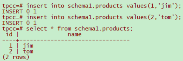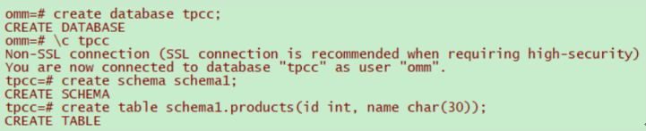 1.创建数据库tpcc,在数据库tpcc中创建模式schema1,在模式schema1中建表products