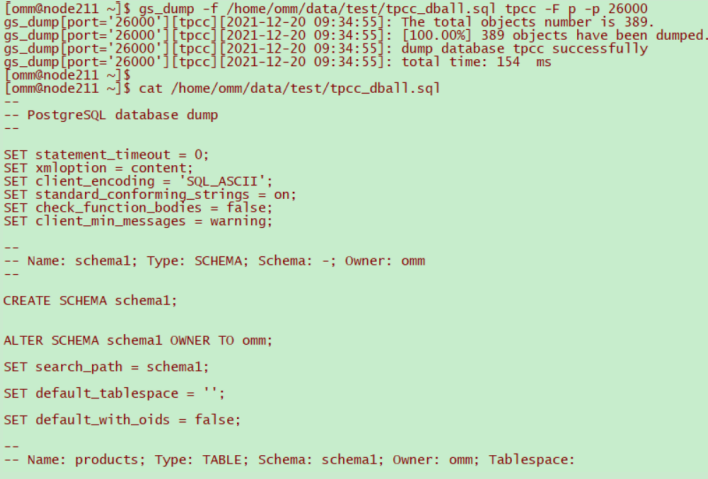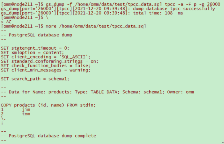 2.使用gs_dump工具以文本格式导出数据库tpcc的全量数据