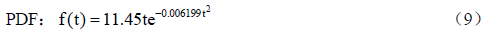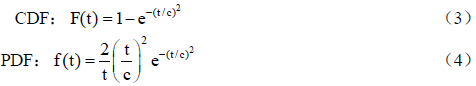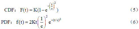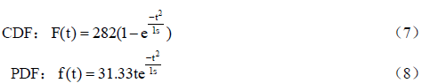 c参数为常量c2tm,tm是f(t)达到峰值时对应的时间。在实际应用过程中,会在公式前面乘一个系数K(K为所有的缺陷数),将K值代入公式(3)和公式(4)中,累积分布函数(CDF)和概率密度函数(PDF)为: