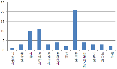 从图9-21中可以看出,该产品问题主要集中在性能、易维护性和易用性方面,如果产品这样上市是很可怕的,必须采取相应的措施来完善这几个方面的问题。