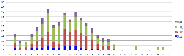 从图9-22中可以看出,致命缺陷和严重缺陷都已经修复,修复所有致命缺陷的时间为17天,修复所有严重缺陷的时间为20天。