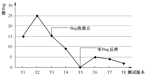 Bug收敛点是指发现的缺陷开始逐渐减少的一个转折点,如图9-5所示,在T3版测试时Bug数量开始出现收敛现象,T3版即为收敛点。