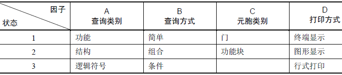 步骤2:对因子—状态表进行加权筛选,本实例中加权筛选时,将打印方式和查询类别中的逻辑符号删掉,不进行分析,加权筛选后的因素分析表见表8-14。使用字母表示因素分析表中各种因子和状态见表8-15。