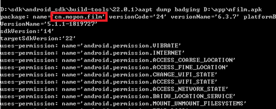 方法二:在sdk的build-tools的版本目录下,运行命令aapt dump badging 安装的apk包名