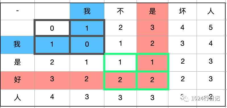 然后进行比对。在正左的第一个字和正上的第一个字的单元格中,进行比较以它为右下角的四格单元格中,最小的数字。