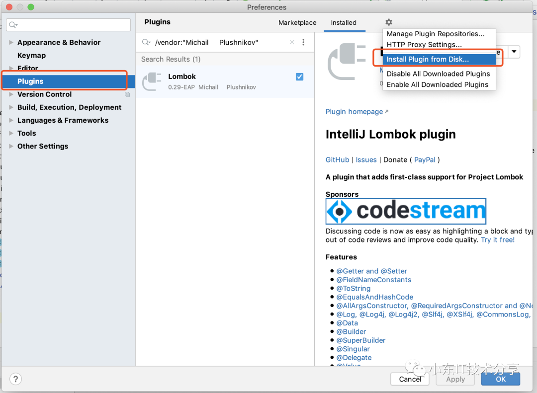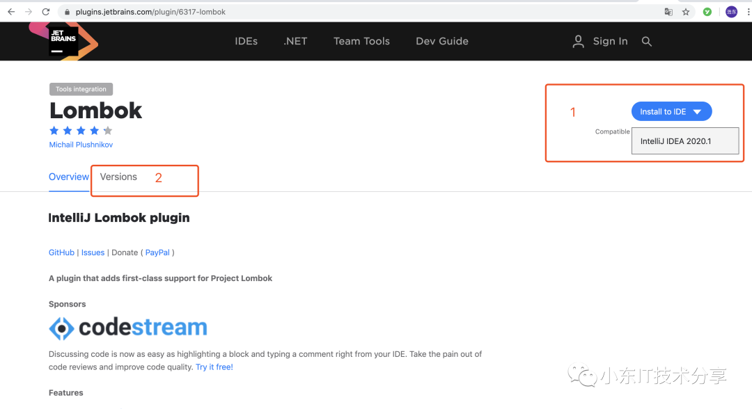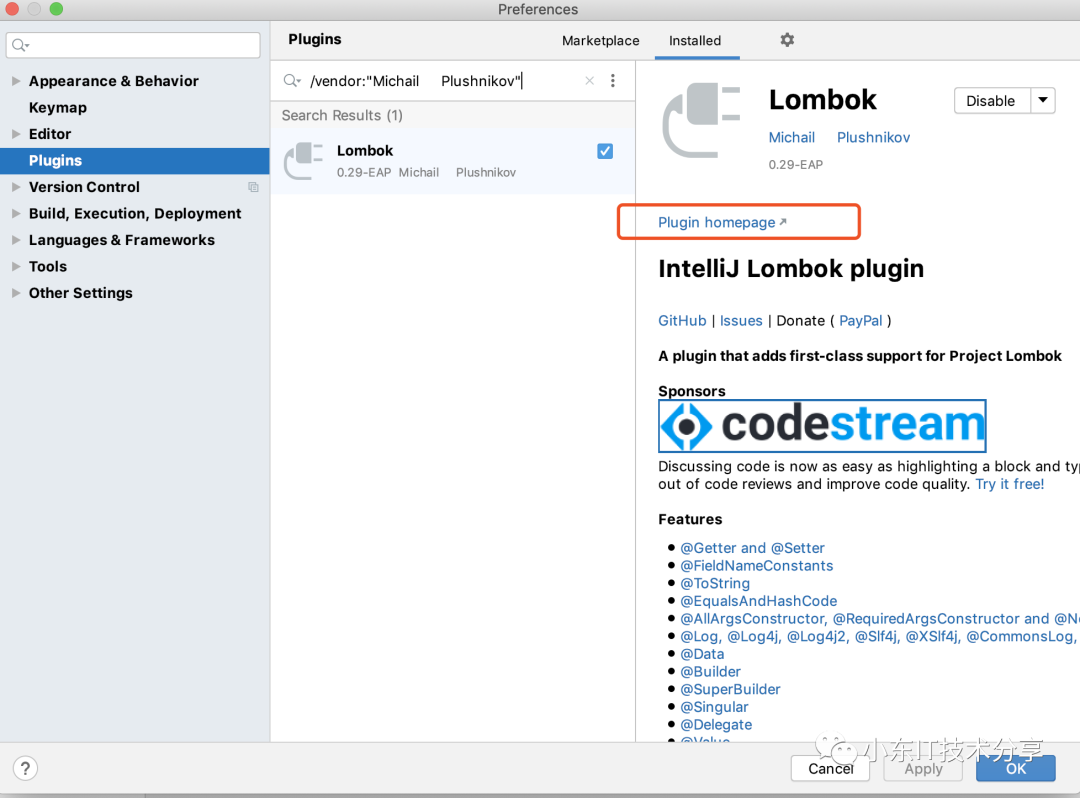 在idea插件中心找到lombok,右边会显示官网插件地址,点进去即可