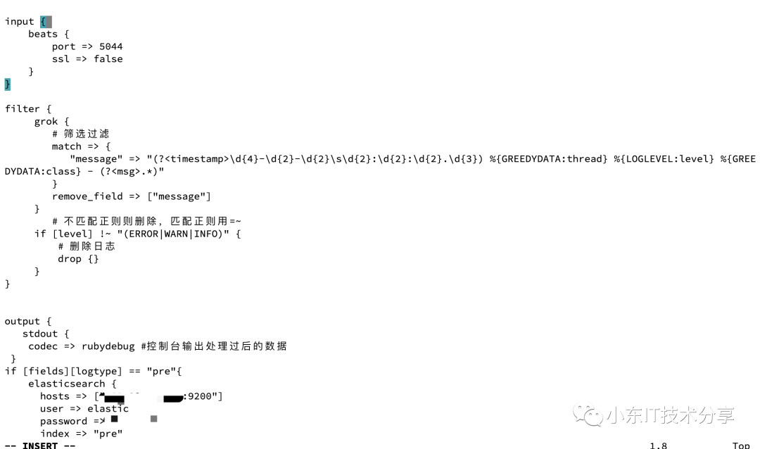 input {beats {port => 5044ssl => false}}filter {grok {# 筛选过滤match => {"message" => "(?<timestamp>\d{4}-\d{2}-\d{2}\s\d{2}:\d{2}:\d{2}.\d{3}) %{GREEDYDATA:thread} %{LOGLEVEL:level} %{GREEDYDATA:class} - (?<msg>.*)"}remove_field => ["message"]}# 不匹配正则则删除,匹配正则用=~if [level] !~ "(ERROR|WARN|INFO)" {# 删除日志drop {}}}output {stdout {codec => rubydebug #控制台输出处理过后的数据}if [fields][logtype] == "pre"{elasticsearch {hosts => ["ip:9200"]user => elasticpassword => xxxindex => "pre"}}if [fields][logtype] == "prex"{elasticsearch {hosts => ["ip:9200"]user => elasticpassword => xxxindex => "prex"}}}