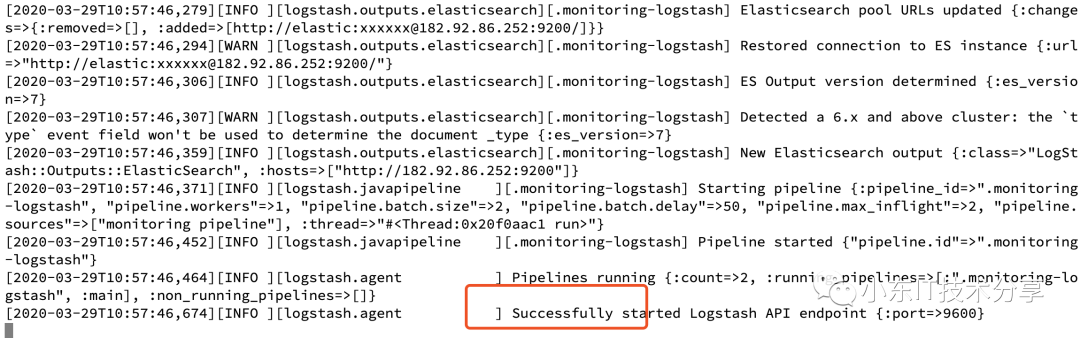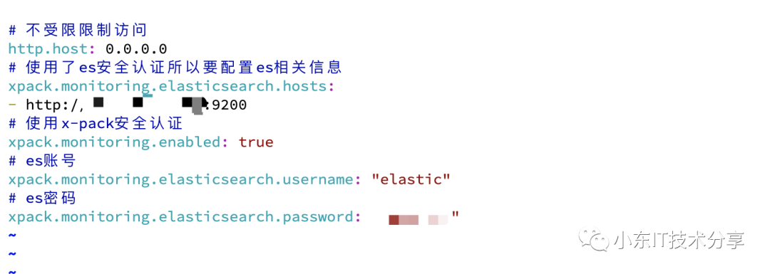 # 不受限限制访问http.host: 0.0.0.0# 使用了es安全认证所以要配置es相关信息xpack.monitoring.elasticsearch.hosts:- http://ip:9200# 使用x-pack安全认证xpack.monitoring.enabled: true# es账号xpack.monitoring.elasticsearch.username: "elastic"# es密码xpack.monitoring.elasticsearch.password: "xxx"