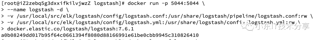 docker run -p 5044:5044 \--name logstash -d \-v /usr/local/src/elk/logstash/config/logstash.conf:/usr/share/logstash/pipeline/logstash.conf:rw \-v /usr/local/src/elk/logstash/config/logstash.yml:/usr/share/logstash/config/logstash.yml:rw \docker.elastic.co/logstash/logstash:7.6.1
