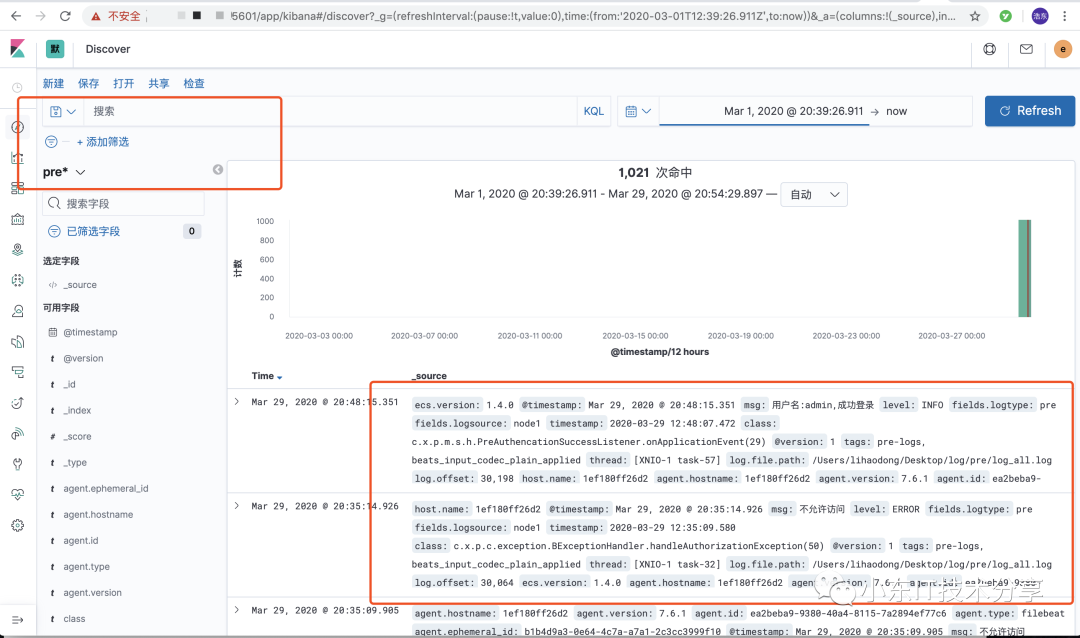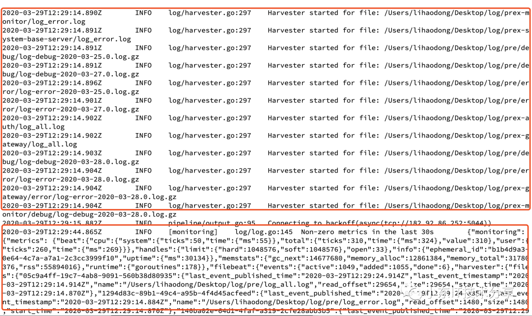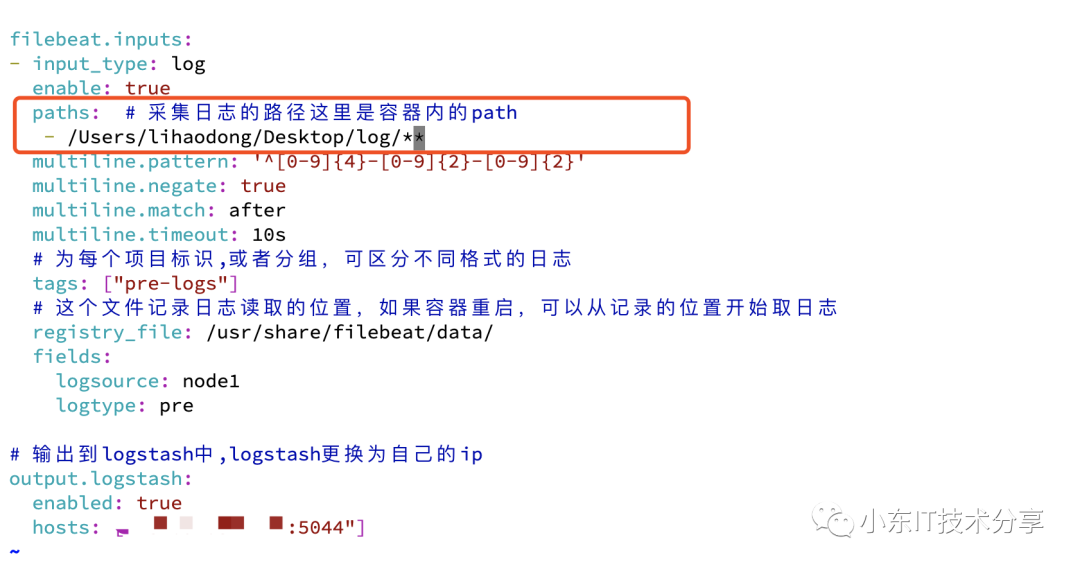 filebeat.inputs:- input_type: logenable: truepaths: # 采集日志的路径这里是容器内的path- /Users/lihaodong/Desktop/log/**multiline.pattern: '^[0-9]{4}-[0-9]{2}-[0-9]{2}'multiline.negate: truemultiline.match: aftermultiline.timeout: 10s# 为每个项目标识,或者分组,可区分不同格式的日志tags: ["pre-logs"]# 这个文件记录日志读取的位置,如果容器重启,可以从记录的位置开始取日志registry_file: /usr/share/filebeat/data/fields:logsource: node1logtype: pre# 输出到logstash中,logstash更换为自己的ipoutput.logstash:enabled: truehosts: ["ip:5044"]