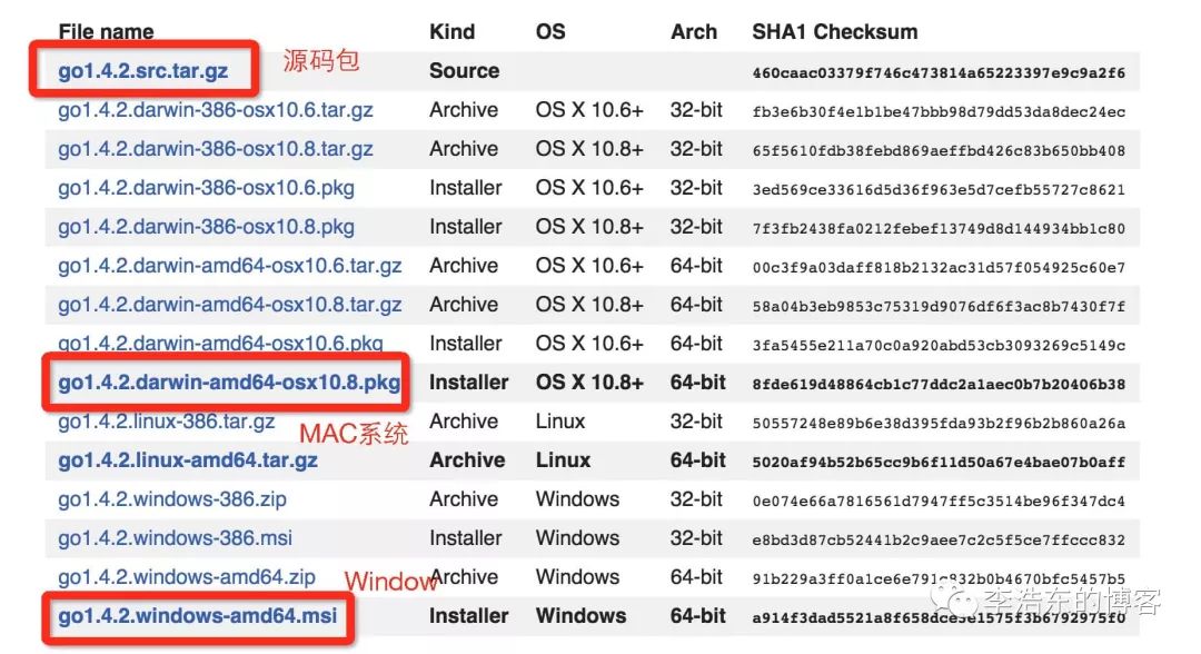 操作系统 包名 Windows go1.4.windows-amd64.msi Linux go1.4.linux-amd64.tar.gz Mac go1.4.darwin-amd64-osx10.8.pkg FreeBSD go1.4.freebsd-amd64.tar.gz
