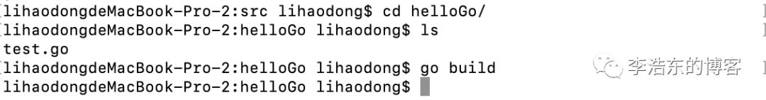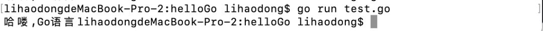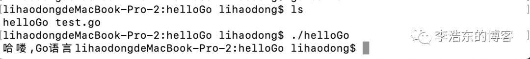 这样,我们就成功调用了之前的库文件,并且你会发现在当前文件夹中多了一个可执行文件 helloGo 没错,就是这样的一个执行文件。再执行下面的命令