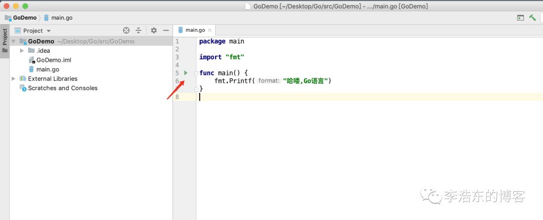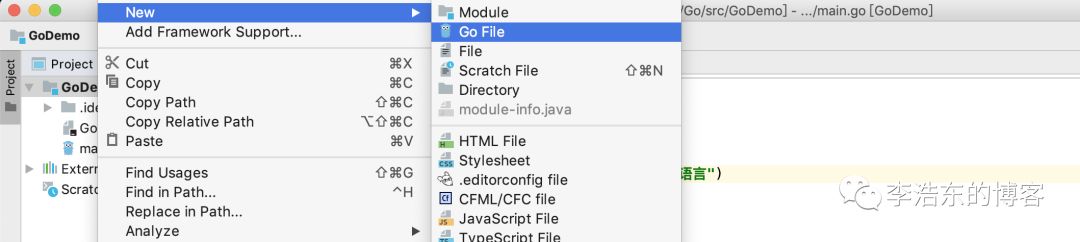 创建Go代码 选择项目名 - New - Go File - main