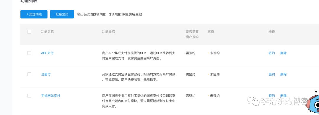 关于功能列表,默认提供 APP支付、手机网站支付、当面付三种功能,如果需要其他更多功能可以通过【添加功能】添加上来,常用的功能有 电脑网站支付、APP支付宝登录、获取会员信息、单笔转账到支付宝账户等