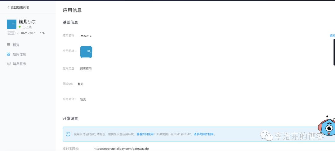 5) 创建成功后紧接着需要完善应用的信息,如应用图表,需要接入的支付宝功能、以及一些参数配置等,配置完成后【提交审核】,然后等待审核结果 审核通过就是下图这样子 查看详情进行你的配置