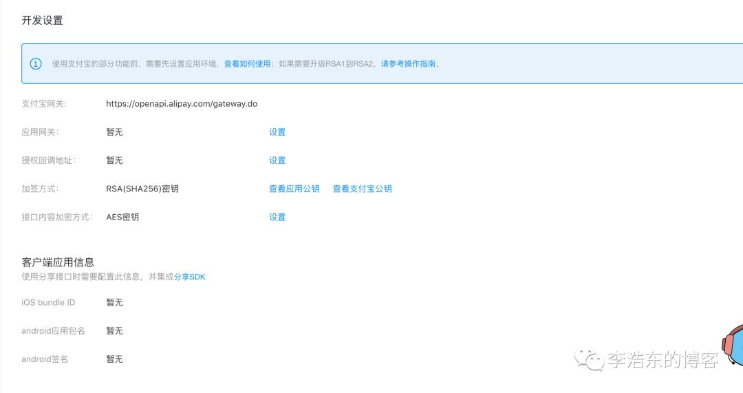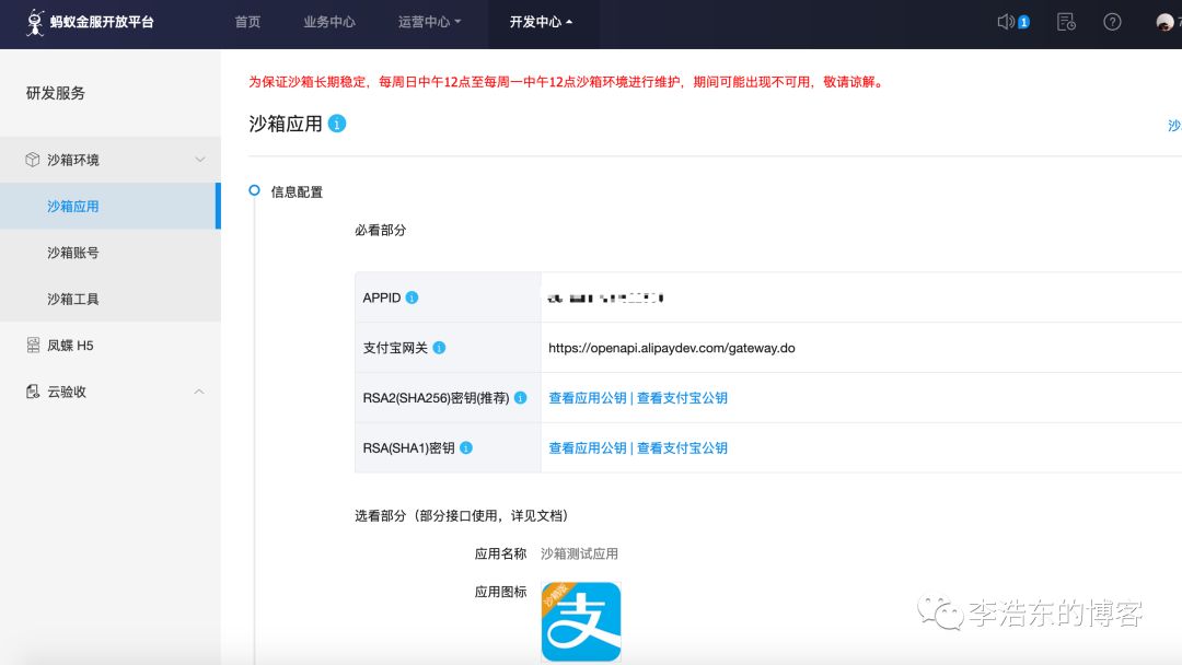 注意:沙箱环境已经创建好了一个测试应用并签约了所有功能,但是仍然有一些信息还需自己完善,如秘钥、应用网关、授权回调地址(选看部分的RSA(SHA1)密钥、AES密钥不是必须设置的)这些参数在上面已经讲过了,将这些信息配置完成后就可以开发了
