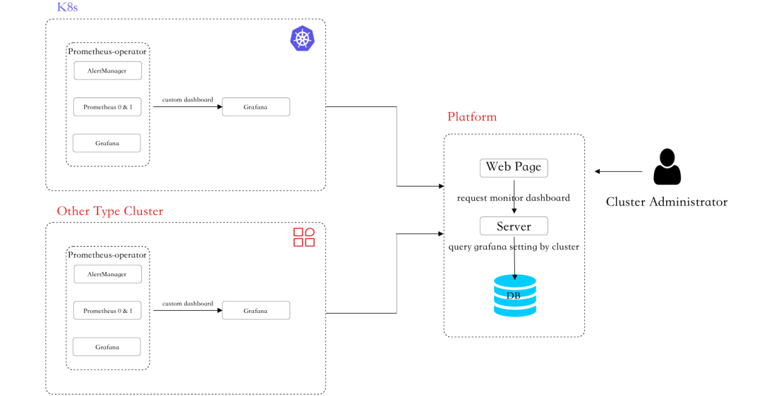 集群管理员在安装集群时,将自定义的 Grafana 安装到集群中,并配置 Prometheus-operator 安装的 Prometheus server 作为 Grafana 的数据源;
