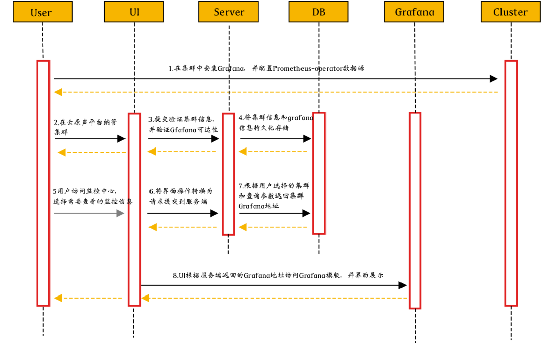 云原生UI提交集群信息到云原生服务端,服务端验证集群信息,并验证 Grafana 访问可达性;