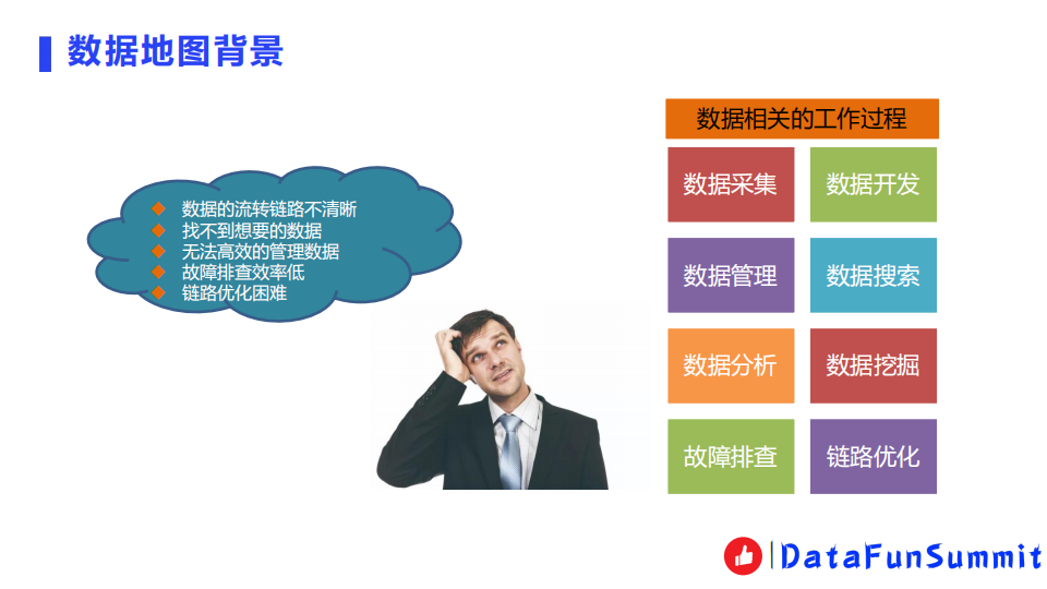 每个企业都有和数据相关的工作过程,如数据采集、数据开发、数据搜索、数据管理、数据分析、数据挖掘,还有故障排查、链路优化等,这些都是和数据相关的。在这些工作过程中通常会遇到很多痛点: