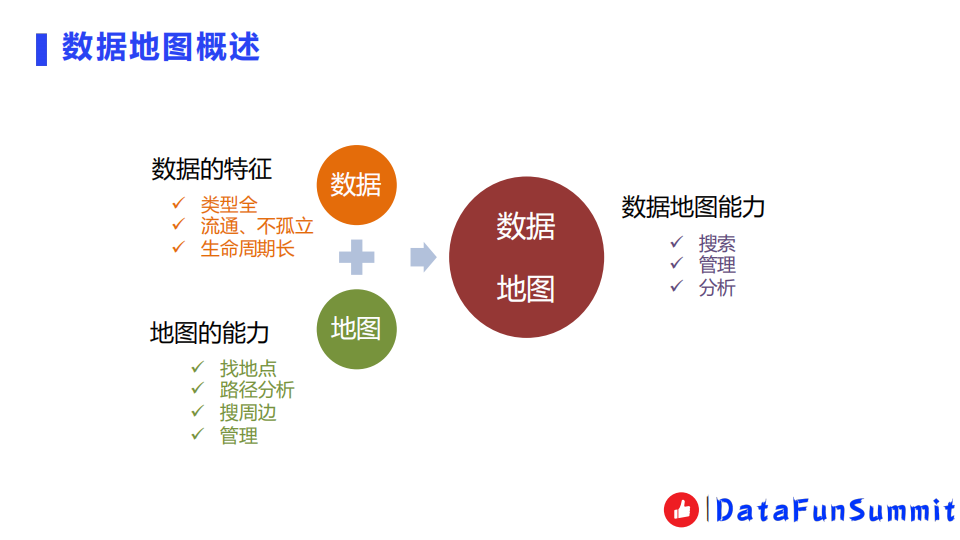 为什么叫数据地图?数据地图其实就是“数据+地图”。地图大家都不陌生,如高德地图,具有找地点、路径分析、搜索周边相关、地点管理等能力。数据也具备独立特征,包括类型全、数据是流通的不是孤立的、数据生命周期比较长。