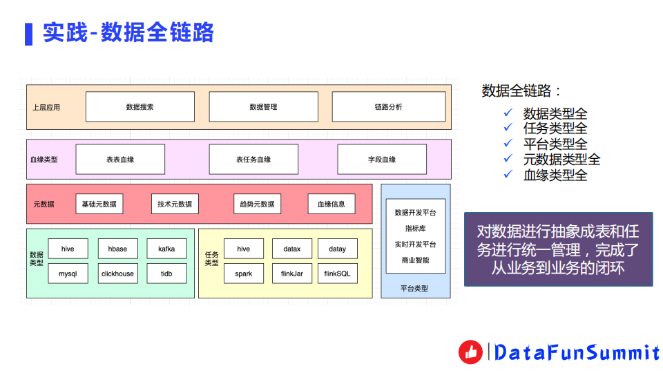 之所以称为数据全链路,是因为其覆盖数据类型、任务类型、平台类型、元数据类型、血缘类型都比较全。其中,元数据包含了基础元数据,技术元数据,趋势源数据、血缘信息;血缘类型实现了表表血缘、表任务血缘、字段血缘。基于强大的基础采集能力,构建了上层的数据搜索、数据管理、链路分析等应用。有赞数据地图对各个平台采集的数据进行抽象,抽象成表和任务模型进行统一管理,完成了从业务到业务的闭环。
