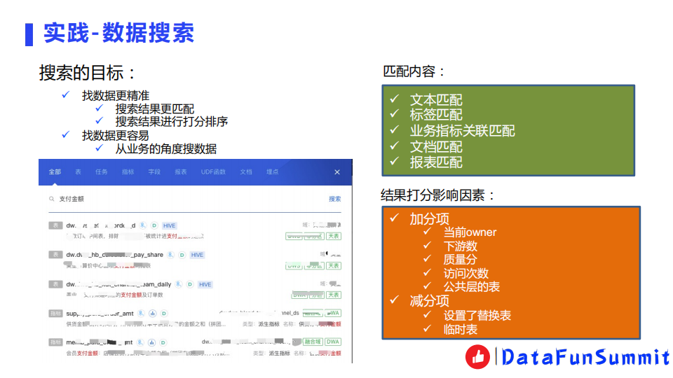 解决数据更精确的问题,首先匹配的内容是比较广泛的,包括表、任务、标签、业务指标、文档、商业智能的报表等都是有赞匹配的内容,见截图。在匹配内容符合基本查询条件后,把最想找的数据优先排在前面。实现数据优先排序,是根据搜索结果项进行打分,分数较高的排在前面。打分会包含加分项和减分项。加分项包括当前owner、下游数越多、质量分越高、访问次数越多、公共层的表,均是作为加分项优先展示;减分项则包含设置了替换表(该表后续不再维护或会被新表替代)、临时表,均为不推荐表,作为一个减分项。每项均设置一个相对应的权重,最终得出分数进行排序,将分数高的优先呈现给用户,实现找数据更精确,更匹配用户搜索的诉求,这是有赞对于数据搜索的优化。